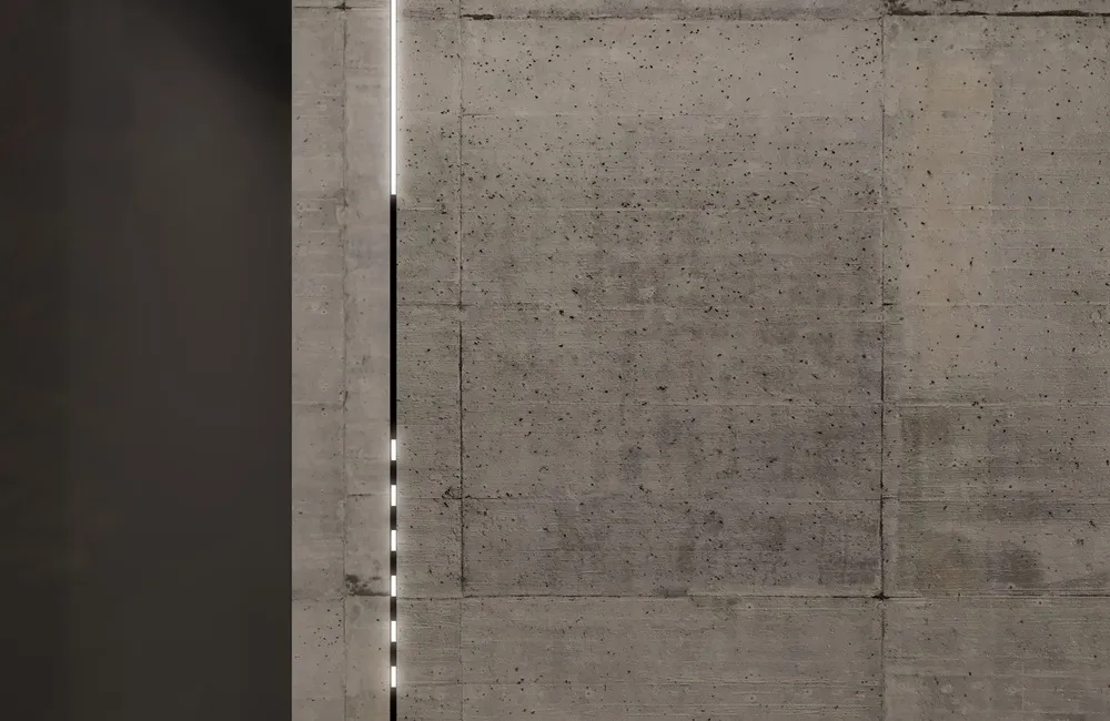 Un perete decorativ cu finisaj dur, segmentat în panouri bine definite aduce un aer industrial și minimalist interiorului. O bandă luminoasă verticală, integrată discret accentuează liniile designului și adaugă un contrast modern cu un efect vizual puternic și contemporan.