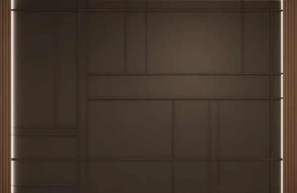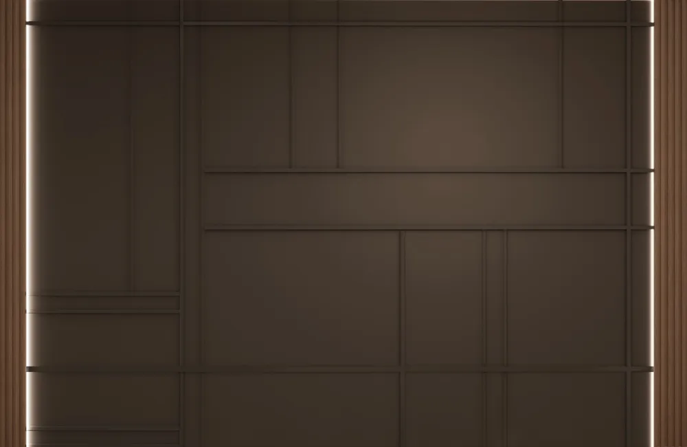 Cu un design contemporan, acest perete îmbină un panou central amplu într-o nuanță profundă de ciocolatiu mat, cu un model geometric subtil. Secțiunile laterale canelate, iluminate elegant cu benzi LED verticale, adaugă textură și o notă sofisticată.