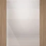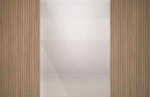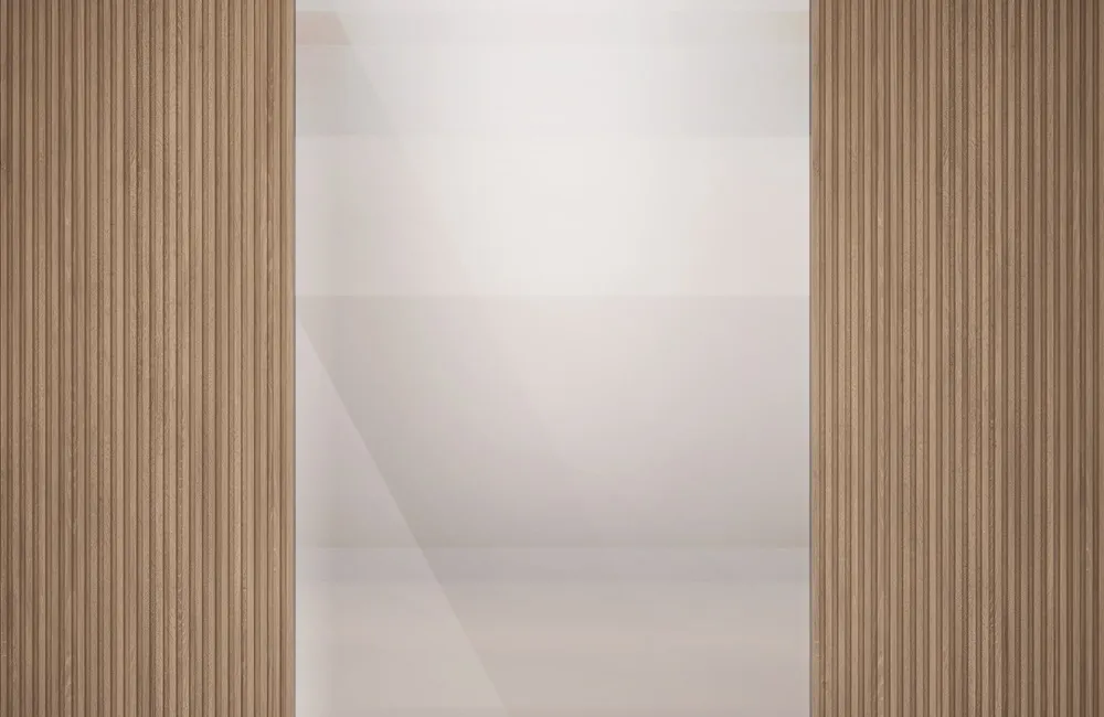 Cele două secțiuni laterale cu lamele verticale din lemn în nuanțe calde creează un fundal texturat și primitor. În centrul compoziției, o suprafață netedă, translucidă, de un alb-bej deschis adaugă un element de subtilitate și luminozitate conturând o sursă discretă de lumină.