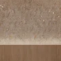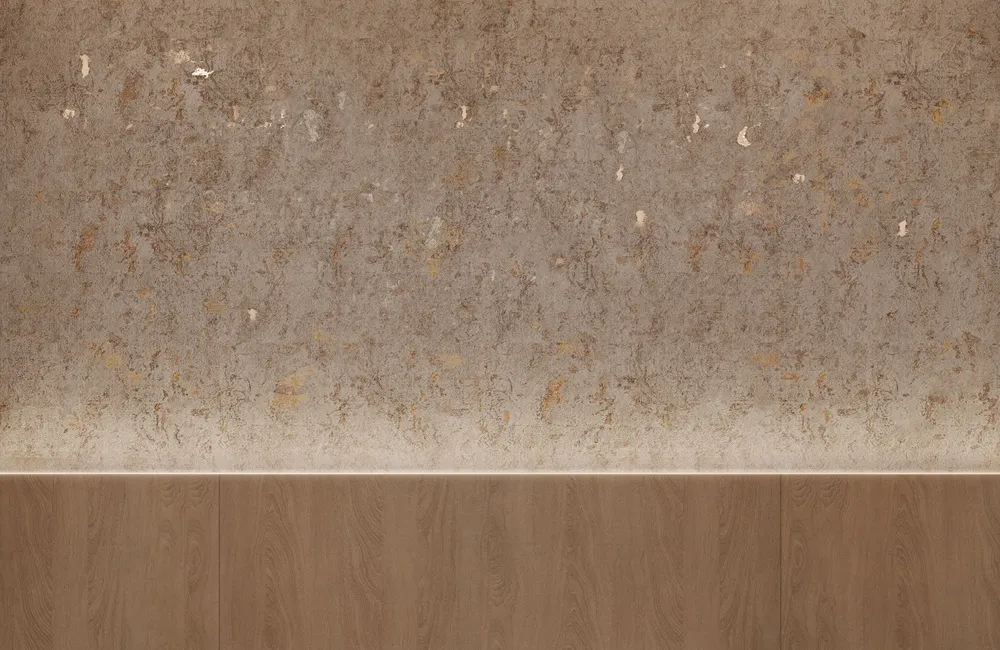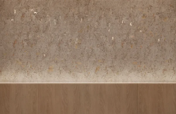 Partea superioară a peretelui este finisată cu o textură în tonuri de gri-bej evidențiată de accente aurii care oferă spațiului. Secțiunea inferioară este placată cu panouri din lemn deschis cu o granulație naturală vizibilă, care echilibrează vizual compoziția și oferă căldură